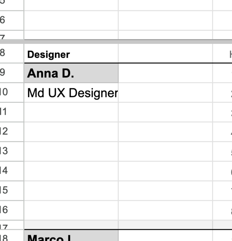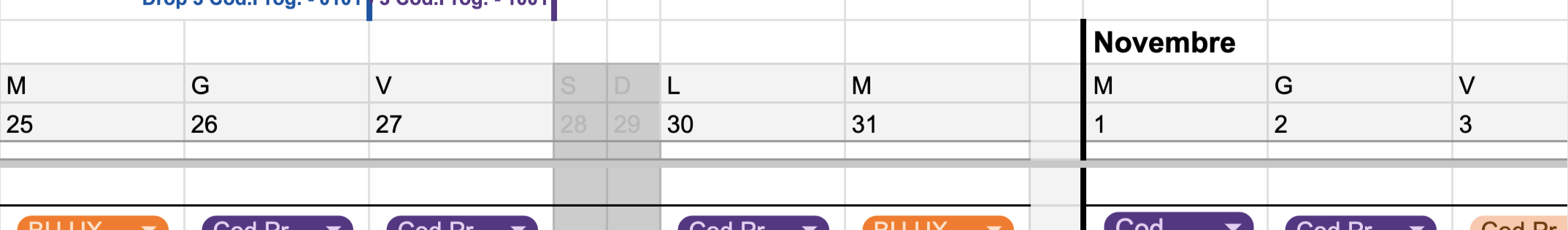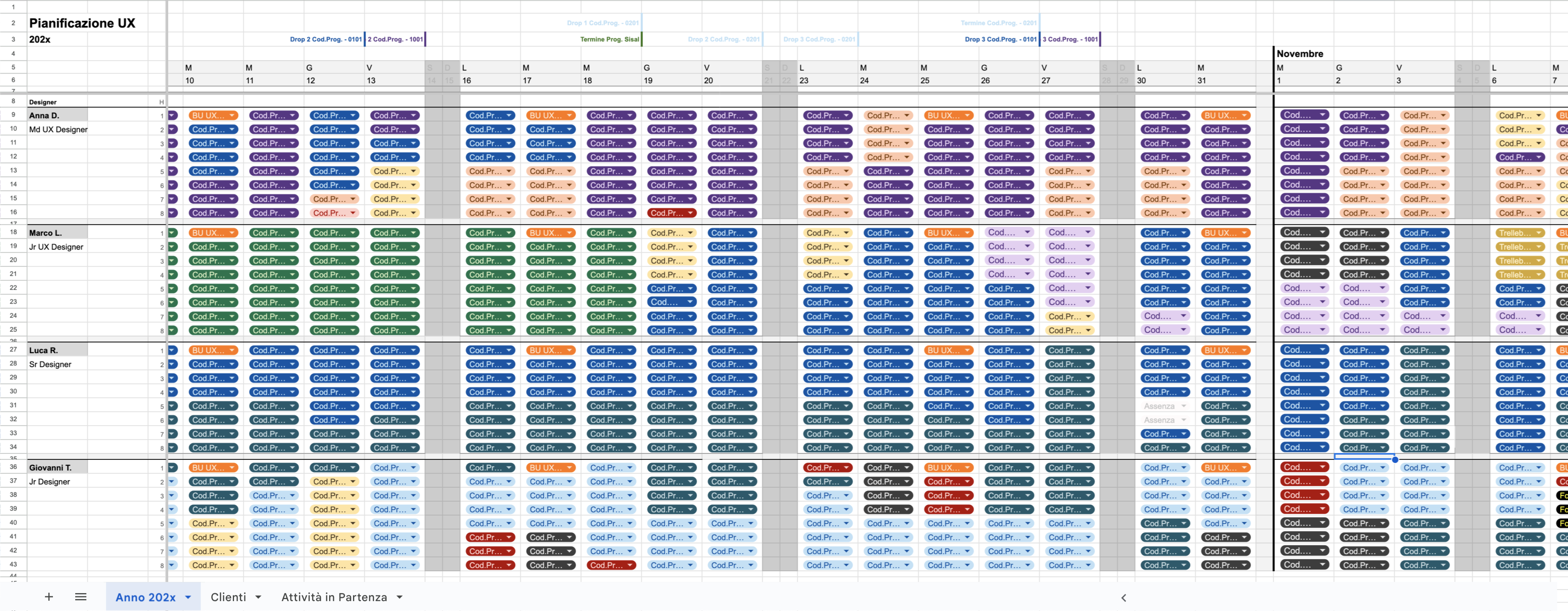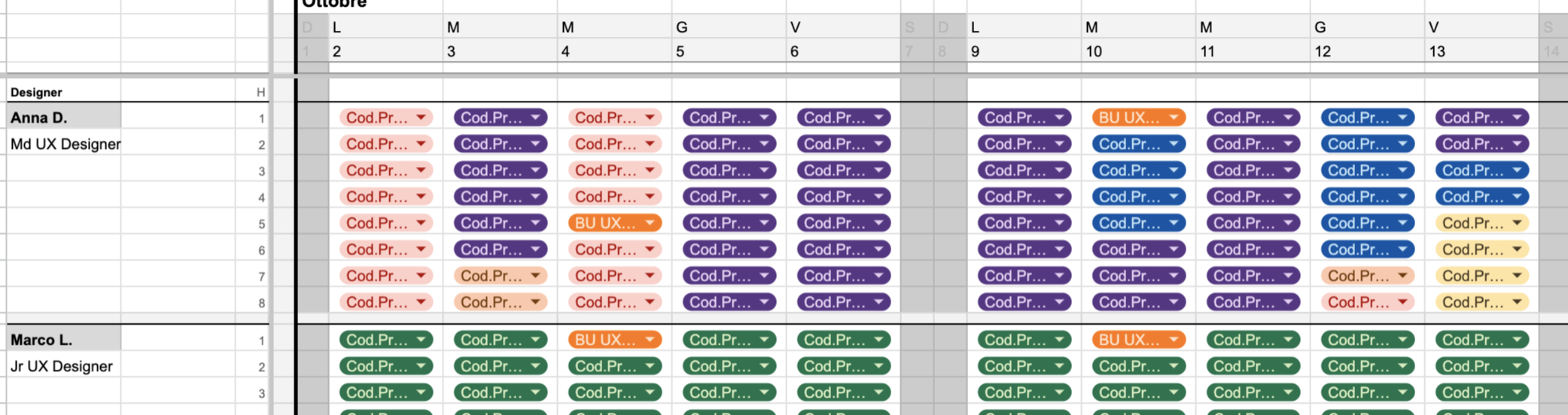 Definita la suddivisione della linea temporale avevo bisogno che questa venisse riempita, verticalmente, da quanto assegnavo ad ogni singola risorsa che ha trovato un, ovvio, inserimento nella prima colonna (da sinistra) della tabella. Ero pronto ad essegnare a ciascuno i progetti e/o i clienti che stava seguendo e dedicarmi al punto successivo: avere un riscontro sul tempo effettivo rispetto al tempo stimato.