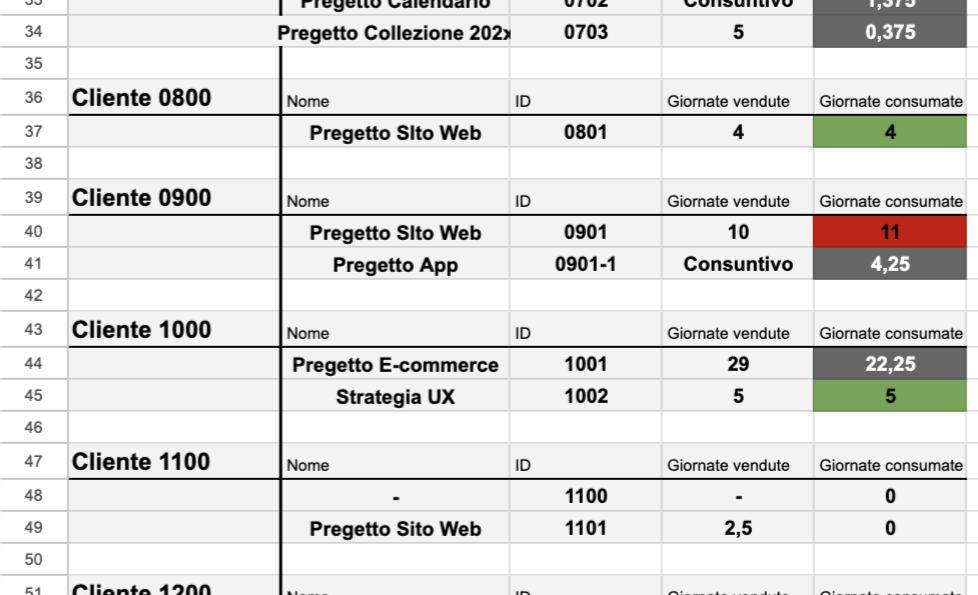 Quando si vende un progetto si stima il tempo che, ipoteticamente, ci vorrebbe per farlo e viene da se che stare all’interno di quel tempo durante la progettazione è importante. Avevo quindi la necessità che il tempo stimato, anche se correttamente suddiviso, rientrasse nell’arco temporale di durata del progetto. Una seconda tabella mi diceva quanto tempo effettivo stavano consumando i progetti e quanto ne avevano ancora a disposizione.