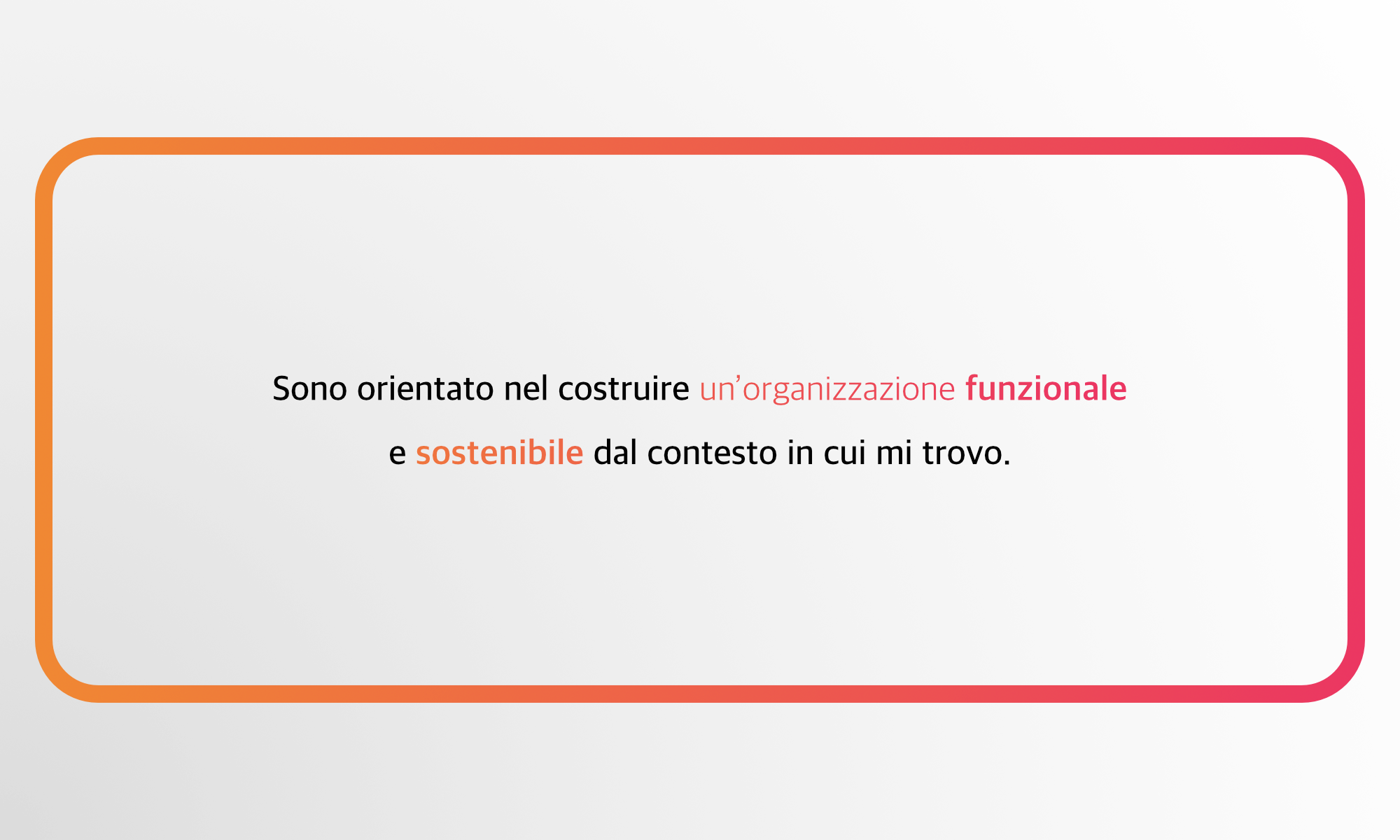Sono orientato nel costruire un’organizzazione funzionale e sostenibile dal contesto in cui mi trovo. Non la migliore in assoluto, non quella perfetta, ma una buona organizzazione può aiutare una gestione oculata di due fattori critici nella progettazione: il tempo e le risorse. La loro sinergia funzionale ottimizza il lavoro di tutti attraverso una migliore gestione delle attività e dei flussi di lavoro, massimizzando i risultati che si otterranno.