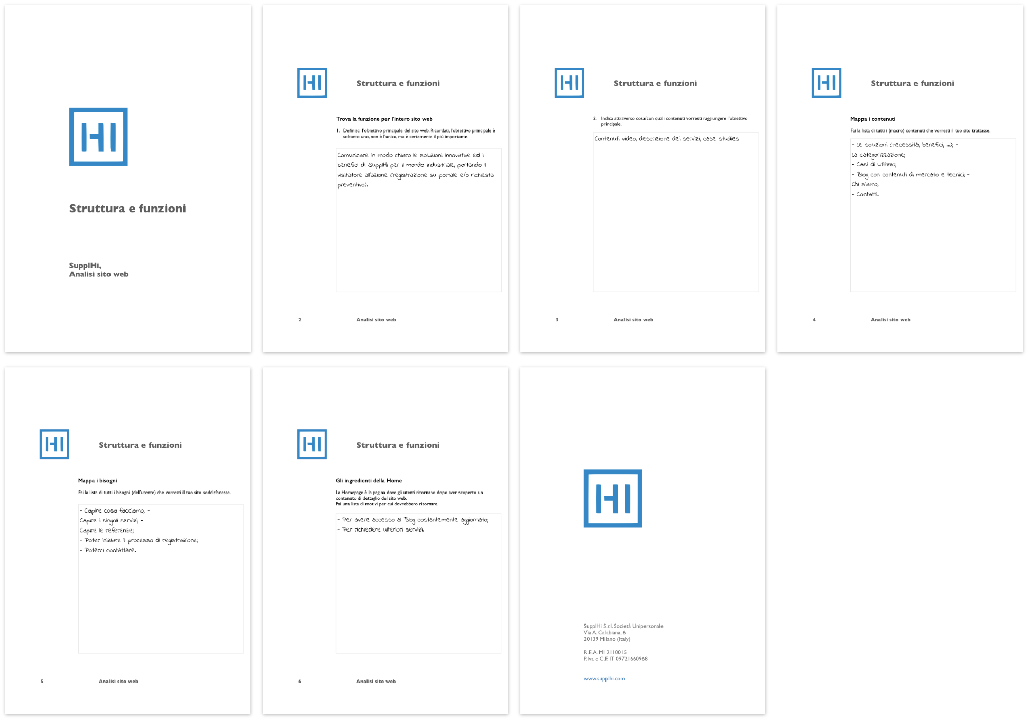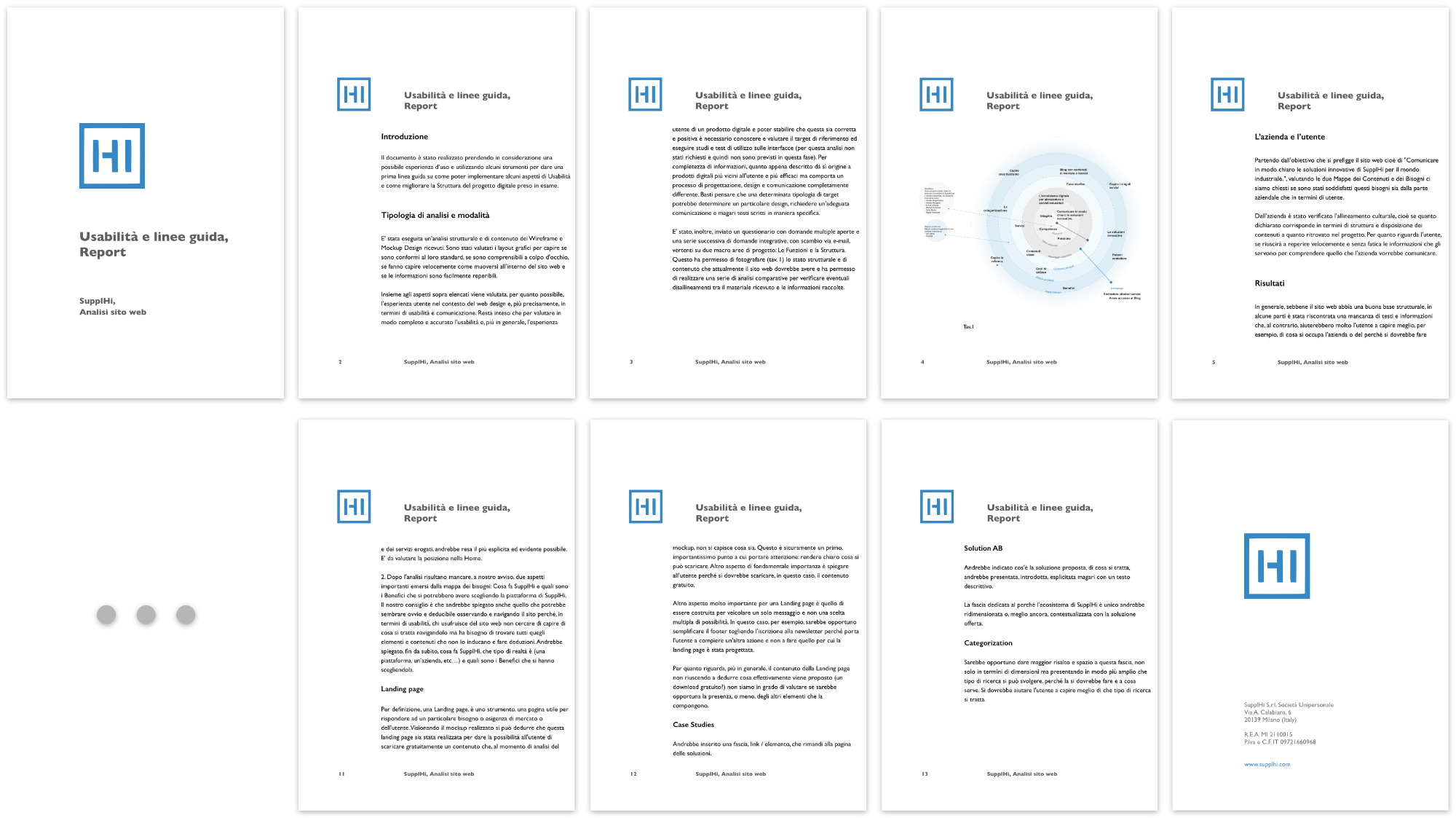 A titolo di esempio rappresentativo, per scoprire quali errori di usabilità avrebbe potuto incontrare l’utente nel raggiungere il suo obiettivo, cioè “Capire i singoli servizi” (offerti da SupplHi), attraverso il metodo dell’impersonificazione*, ho analizzato in successione la Home, la pagina dei Servizi e le pagine di ciascun servizio, applicando per ciascuna le euristiche UX.