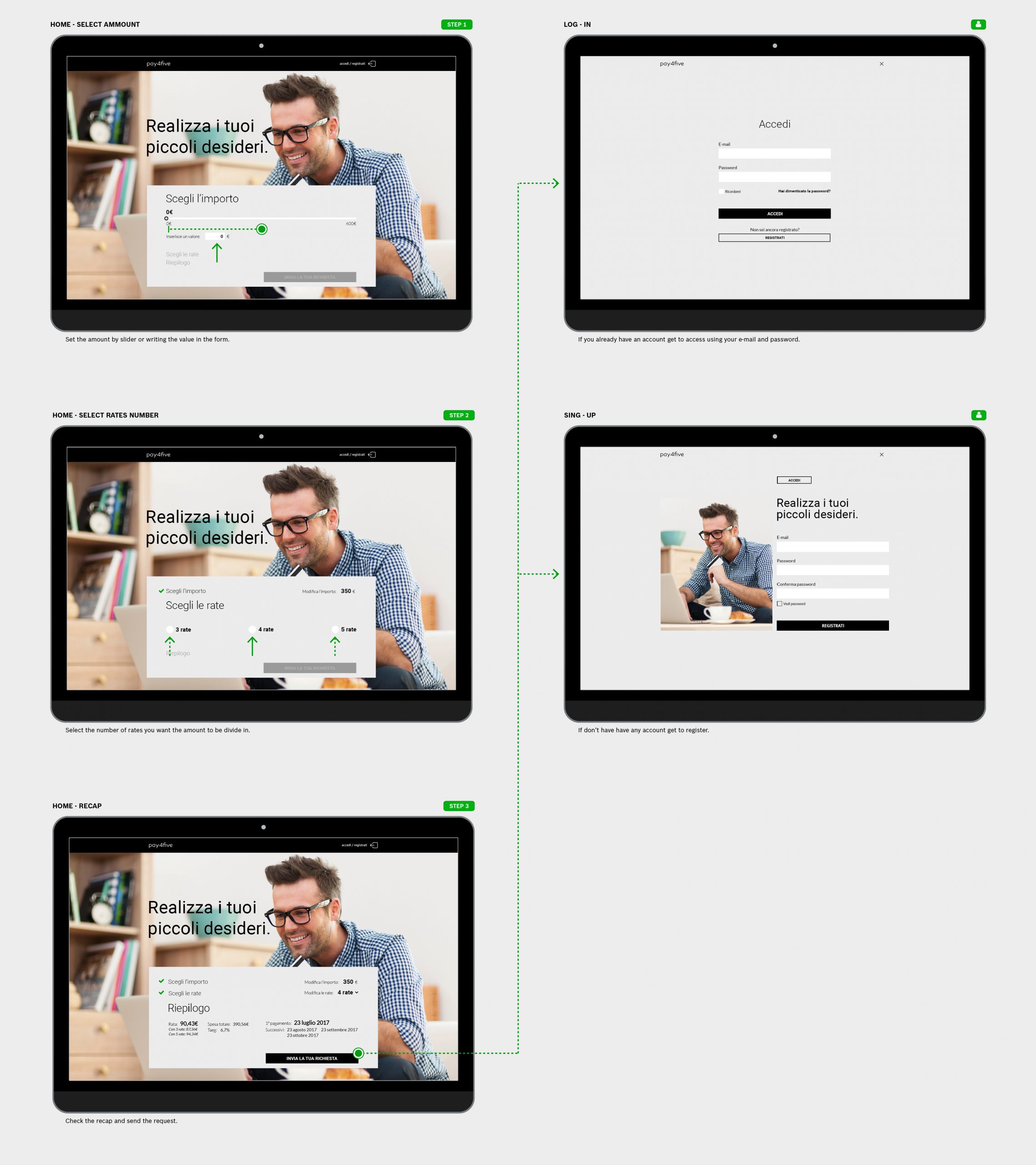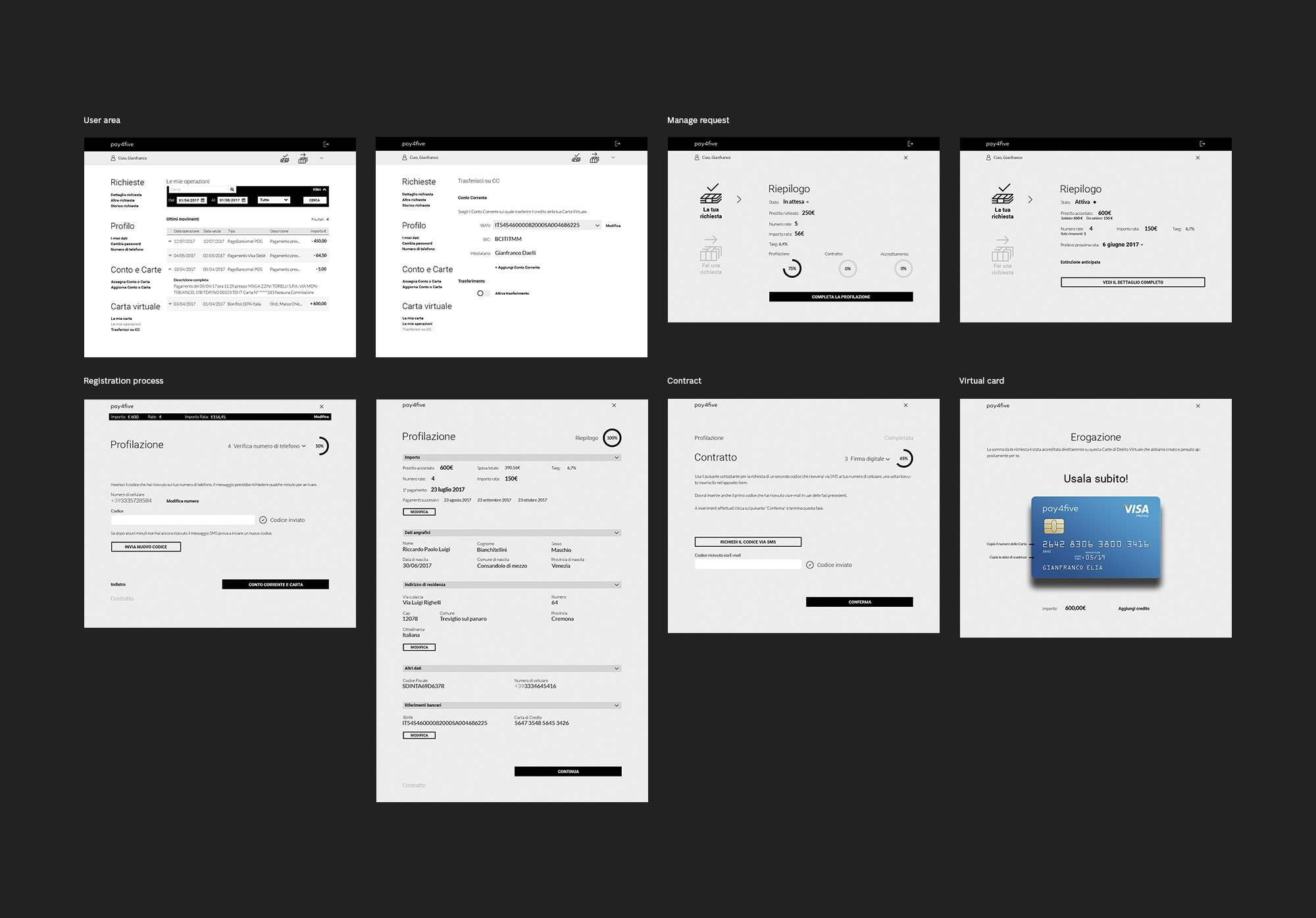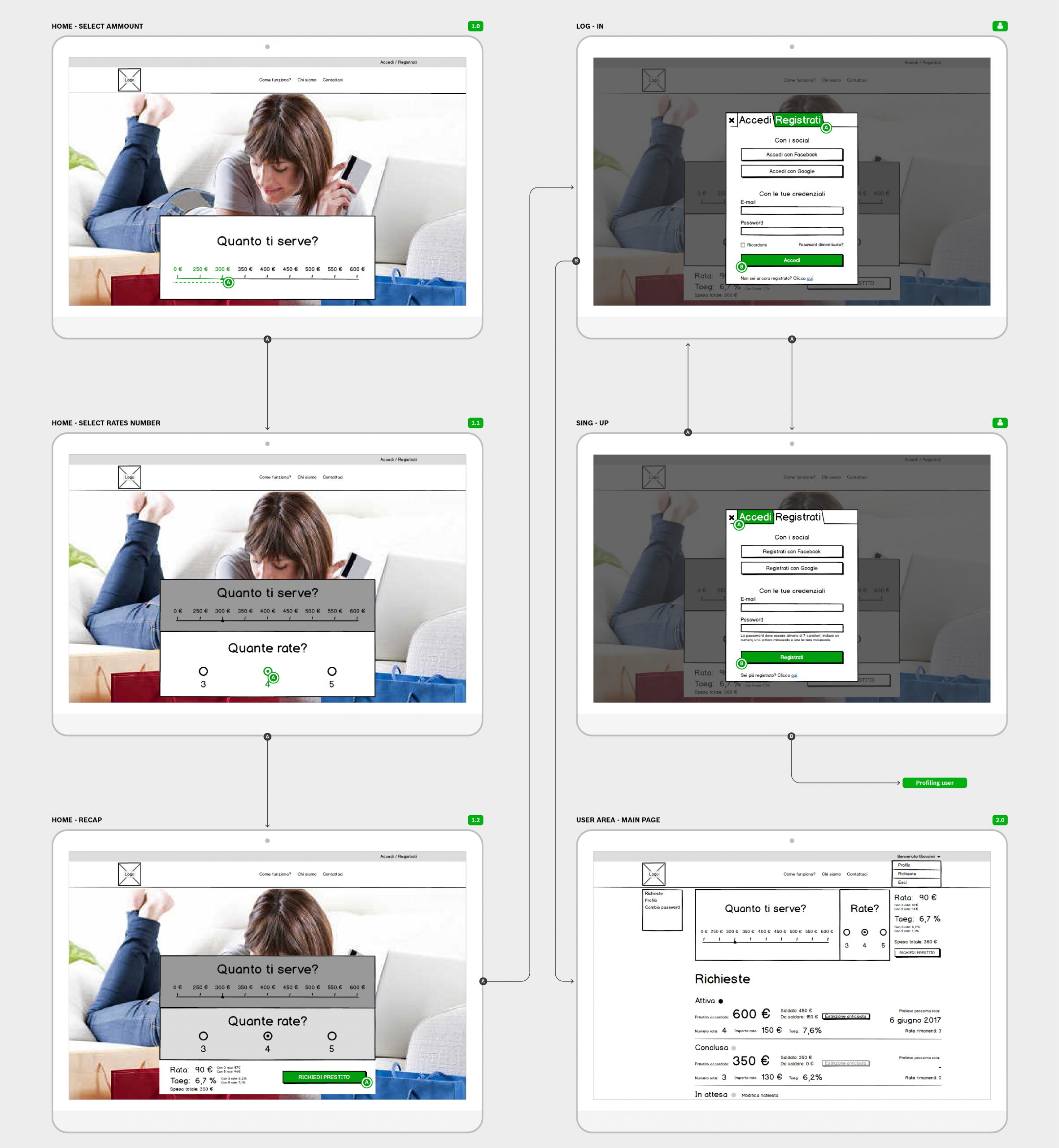 Ho realizzato i wireframe per studiare e definire le prime interazioni dell’utente con le modalità di registrazione e definizione della richiesta di microcredito.