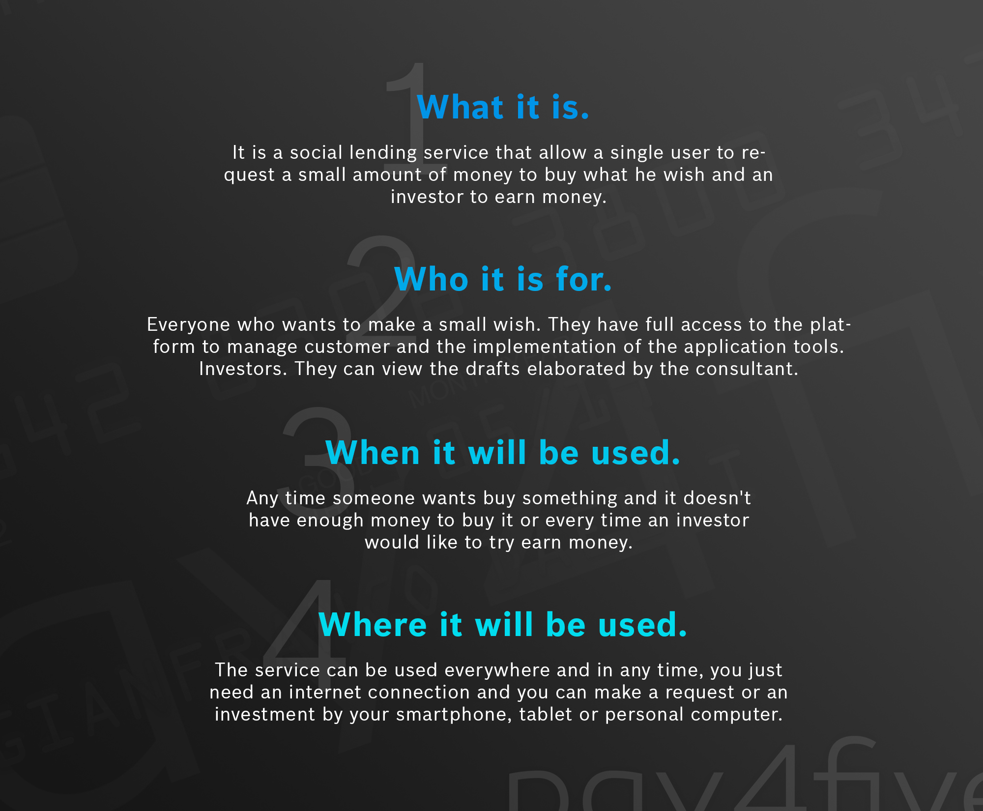 Un possibile caso d’uso di questa piattaforma. Marco vorrebbe acquistare un prodotto che ha appena visto online ma si accorge di non avere abbastanza soldi. Un amico, qualche giorno dopo, gli mostra un servizio di microcredito: in pochi passaggi Marco può finalmente acquistare il Barbeque Grill che tanto desiderava.